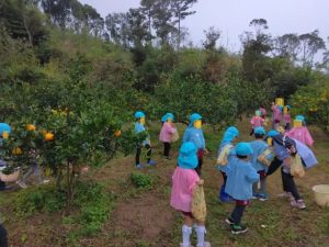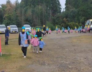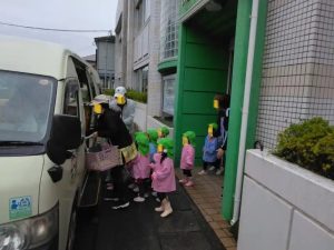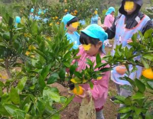 今日は、年長さんと年少々(りす組さん)のみかん狩りの日です。朝から雨模様でしたが、みかん農園の方へ電話すると、「大丈夫ですよ!」ということで予定どおり、園を出発しました。