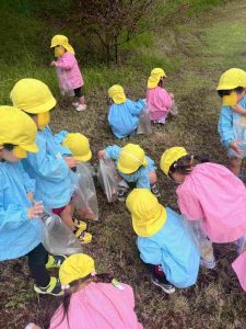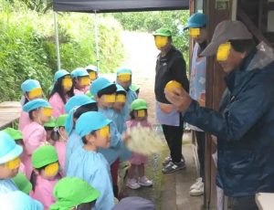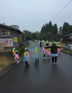 幸い、農園に着くと、雨は上がっていました。駐車場からみかん農園の入り口まで約30Mほど、りす組さんは、すみれのお兄さんお姉さんに手を引いてもらい農園に入りました。