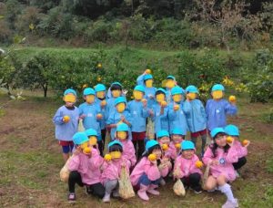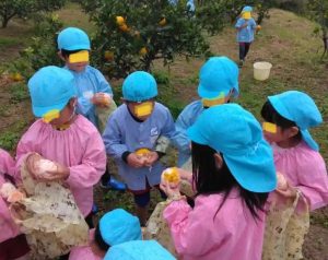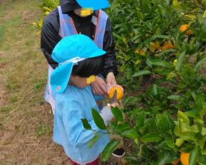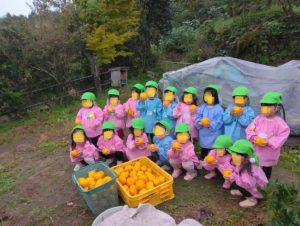 年長さんは、自分で収穫したみかんを1個はその場でいただきました。りす組さんは、誤嚥や後の給食もあるので、一房ずつ味見しました。一房でも実大きく、十分美味しいみかんです。