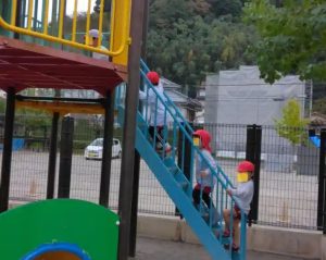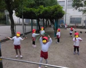 さくら組のお友達、ちびっ子公園の鉄棒の前で縄跳びの練習をしていました。