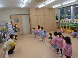 立ち上がり、もう一度、両手を広げて・・・、※午前の部のお友達がしている時は、午後のお友達が後ろで見学・・・