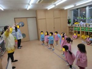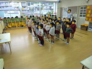年少さんは、メルヘンスイミング教室の日でした。出発前、教室でならんで・・・先頭の二人は、「ここまで届く!」と言って、背伸びをしていました。いろいろなことがどれも楽しい活動の子供たちです。
