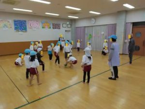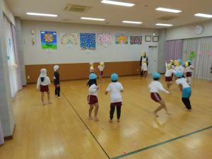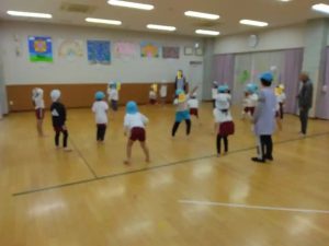 年長さんの体育遊び、雨天ですが、リズム室で元気よく・・・