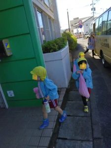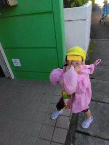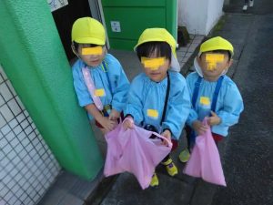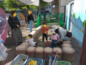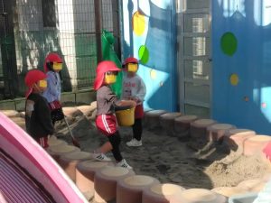 今朝は、昨日の雨があがり放射冷却で、12度くらいと寒さを感じるあさでした。それでも登園すると子供たちは砂場で元気よく遊んでいます。