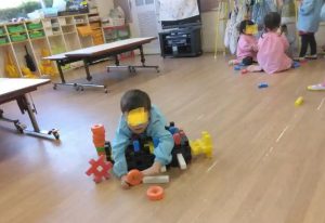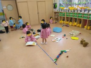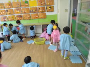 うさぎ組さんのお部屋です。みかん狩りにいくので、遊んでいたブロックやタイルを片付けています。