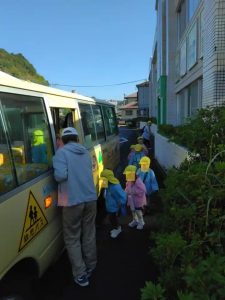 みかん狩りへ、いざ出発! みかん狩りが昨日なら、完全にアウト! みかん狩り中止になっていましたね。今日は快晴、子供たちはついていますね!