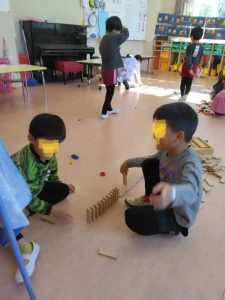 上の写真は、朝の年長さんの教室です。友達と一緒にドミノを並べていました。