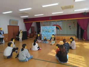 今日は、ハッピーランドがありました。最初は、リズム室で歌をうたったり、11月のお誕生日のお友達の誕生会をしました。