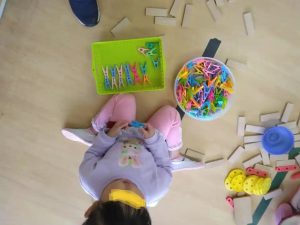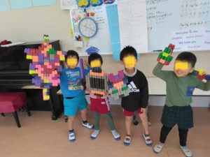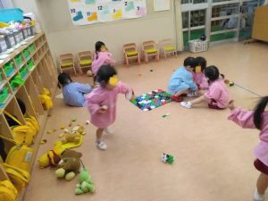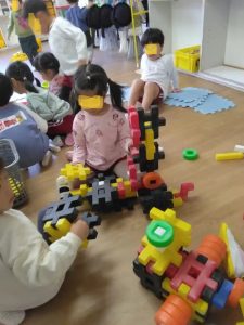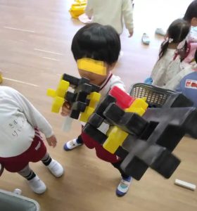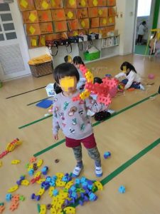 年中さんの登園後の教室です。ブロック遊び・・・ダイナミックな作品ができています。