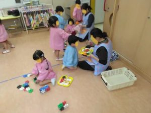 りす組の朝の様子です。先生にトレーに乗せた朝食をご馳走したり、ブロック遊びをしたり、