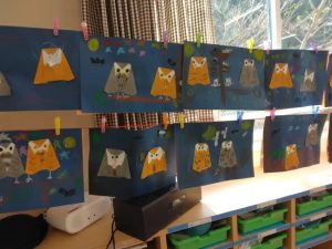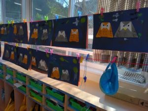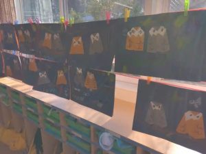 上と下の写真は、年長すみれ組のみんなが、折り紙工作で作ったフクロウです。