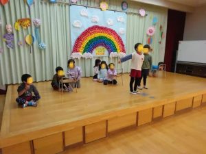 上と下の写真は、年長さんの劇の練習の様子。