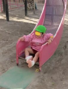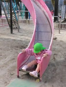 外遊びの活動では、滑り台遊び・・・、上から滑ってくると、勢い余って緑のマットまで行ってしまいますが、