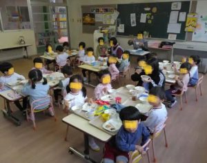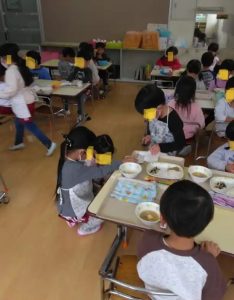 年中さんの給食の配膳の時間に、「汁物がこぼれてしまう。」という、ハプニングがありました。