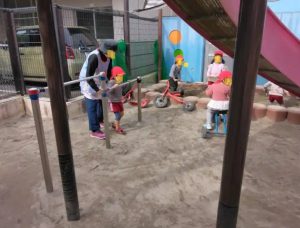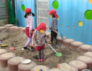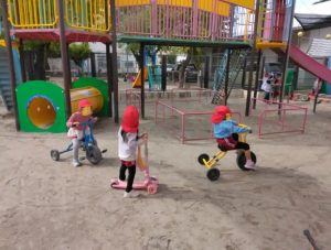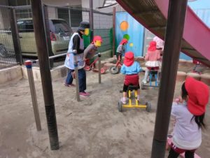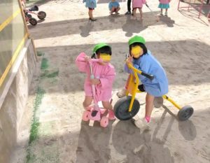 ★下の写真は、砂場や園庭で三輪車に乗ったりして遊ぶ子供たちです。