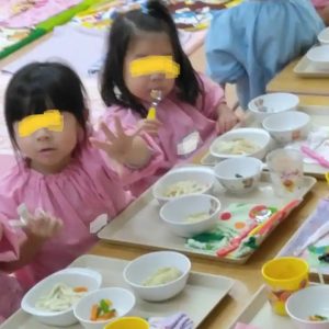 りす組さんは、衣装を着て楽しそうに踊っていましたよ。楽しみにしていてください。写真は、給食の様子。