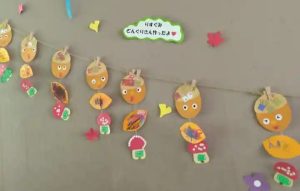 この写真も、りす組さんの作った、ドンぐりと木の葉の作品。二階への階段に飾ってあります。