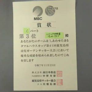 23日(日)の健康の森公園で開催された、鹿児島県幼児サッカー連盟主催、ガーデンサッカー大会でいにしき幼稚園の園児は、3位入賞しました。おめでとう!ございます。3学期の大会では、Bパートに昇格します。 12月・1月も張り切って練習し、サッカーをますます好きになってほしいですね。