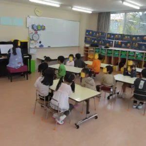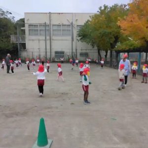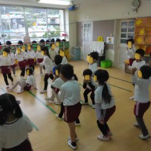 年長さんの朝、みんなで「あわてんぼうのサンタクロース」の歌を歌っていました。