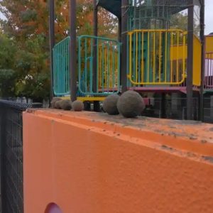 園庭への入り口の塀の上に・・・いくつもの砂団子・・・子供作った作ったもの!時々こうして、保育士の先生方が飾ってあげます。