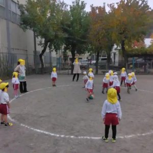 外で、体育遊び、追いかけっこ、その後、園の中と外の子二分かれて、転がしたり、投げたりドッジボール遊びをしました。