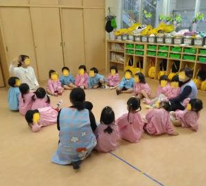各教室では、朝のお話のなかで、「もし、幼稚園で家事になった・・・」という話をして、避難訓練に備えていました。