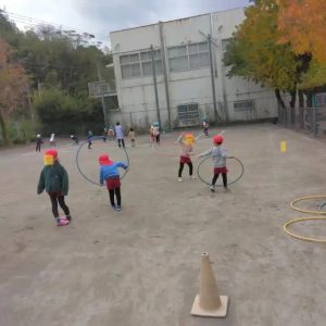 給食後には、広場でフラフープをするうさぎ組の子供たち、奥には、すみれ組のお友達がドッジボールをしています。