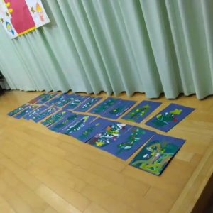 舞台の上には、年長さんがクリスマスツリーをスケッチした作品が並んでいました。よく見て描いています。