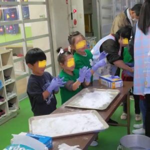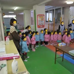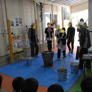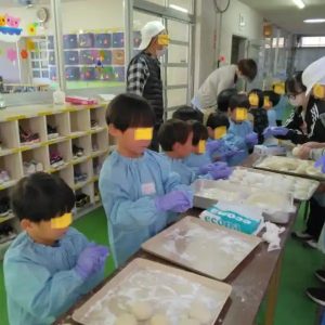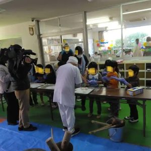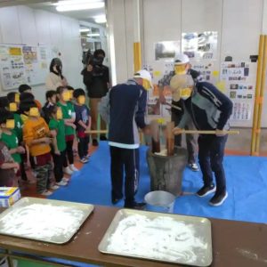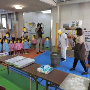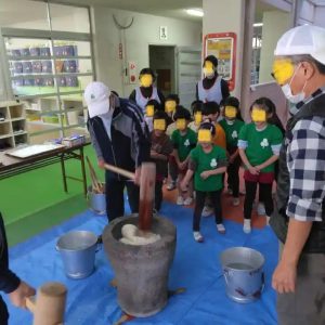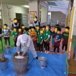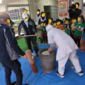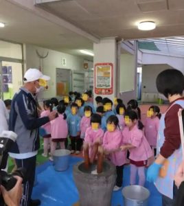 比良田菓子店の御主人、比良田さんも来園し餅つきをサポートしてくれました。因みに、いにしき幼稚園でもちつき大会は、比良田さんの力添えによる行事です。12月の佳い伝統行事になっています。
