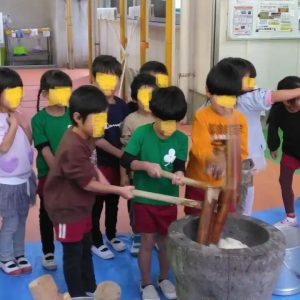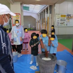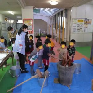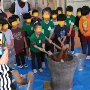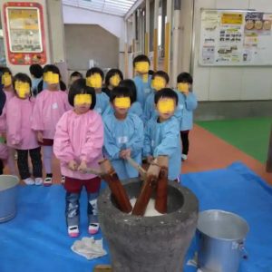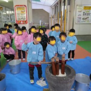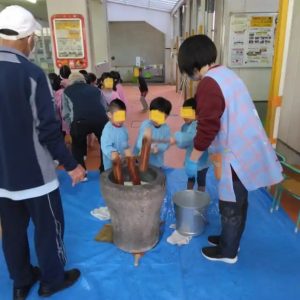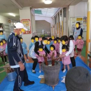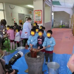教室では、「もういくつ寝るとお正月」の歌を歌う季節ですが、今日、幼稚園で「もちつき大会」がありました。