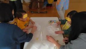 ハッピーランドの1月の遊びは、「米粉粘土遊び」でした。米粉を水で練って・・・油を少しいれて・・・・