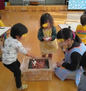 お餅を 火鉢で あぶって! 本物の火鉢に見えますね!