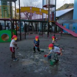 連休明け、7時近くまでは小雨が・・・園児が登園する頃も御覧のような・・・でも、子供たちにとっては、格好の遊び場所になりました。