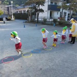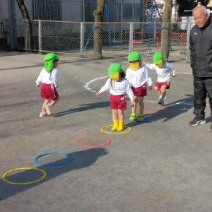 地面に置いた輪を、ピョンピョン跳んで進む遊びです。