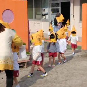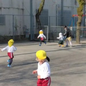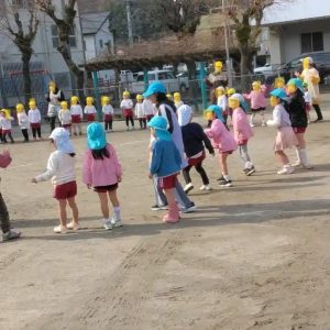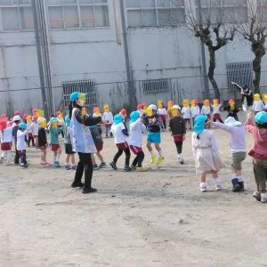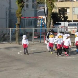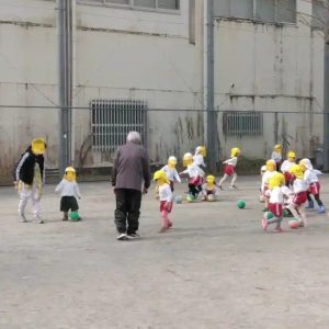 避難訓練の後は、広場で、全園児で「なかよしリズム」がありました。