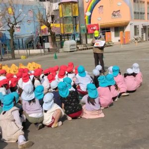 地震の後、火災が発生したという想定で・・・年少・年少々は、避難頭巾もかぶって。