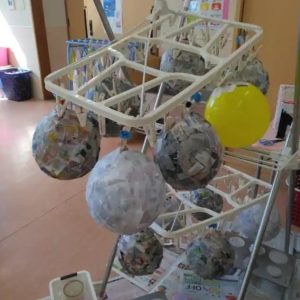 風船に乗りを付けて。新聞紙を貼って・・・、何を作るのでしょう?楽しみですね!