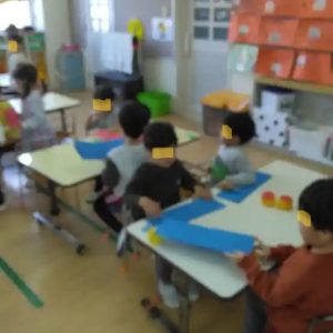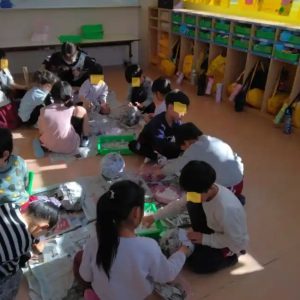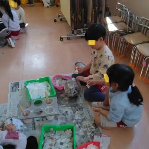 年長さんは、お面作り。先週末の風船に更に新聞紙を貼って頑丈なお面にしています。