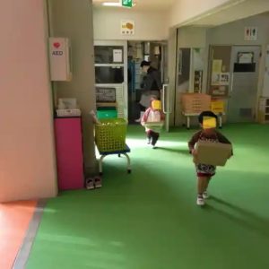 教室が給食室に近いので、当番の子たちが、お盆やお皿を給食室に取りにい行きます。