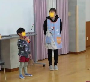最初に指名された、〇〇さん。お父さん・お母さんも沢山目の前にいる中でしたが、しっかり、発表してくれました。