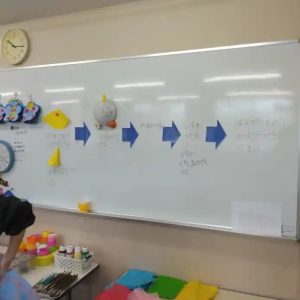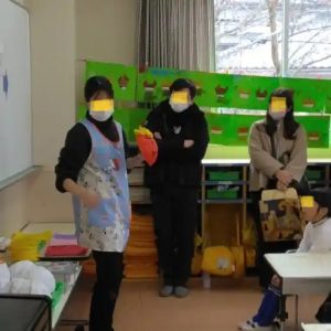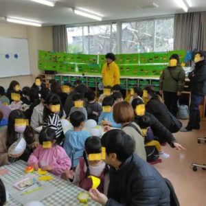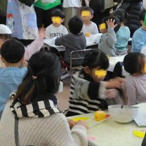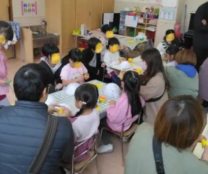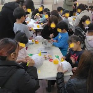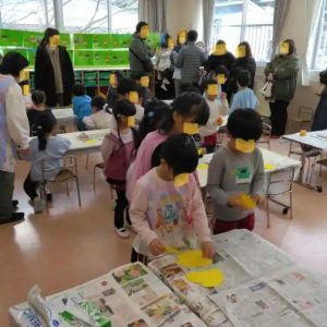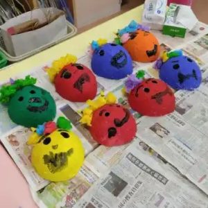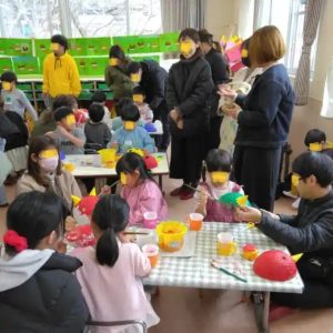 年長さんの参観では、これまでの活動で子供たちが風船と新聞紙を使って作ったお面に、①鬼の角を付け、②目をあけ、③色を塗るとう活動でした。