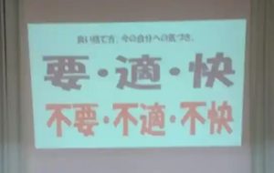 講話の最初に、自分が気持ちよく過ごすことが、家族関係や子供との関係、職場での人間関係、仕事の充実につながるとも話されました。