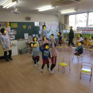 そうです、椅子取りゲームです。 実習生のお姉さんも一緒に楽しみました。