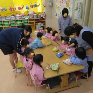 りす組の教室、給食の準備を中学生のお姉さんにも手伝ってもらっていました。