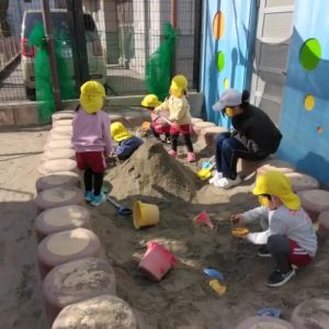 給食の後の砂場、ずいぶん高い山を作っていますね!