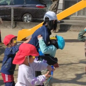 お姉さんたちの職場が今日で終わりだと園児もしっているので、抱っこしてもらったり、
