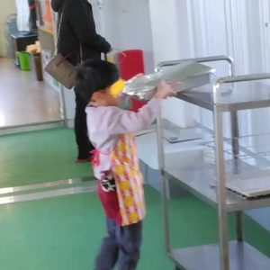 誕生会のあとは、給食。年長さん、リズム室前から。当番さんは食器などを運んでいました。