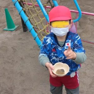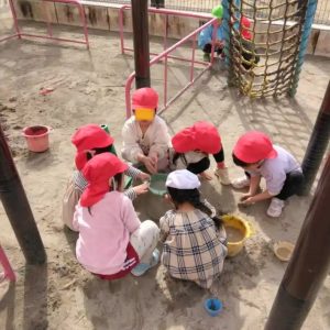 給食のあとは、日も差して・・・友達と輪になって、泥んこ遊びを楽しんでいました。