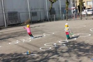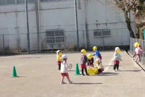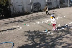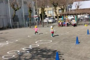 うさぎ組が広場で、二つのチームに分かれてサーキットゲーム・・・