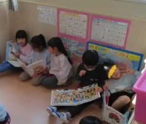 年長さんの部屋を覗くと、活動の合間に、絵本を読んでいる姿がありました。